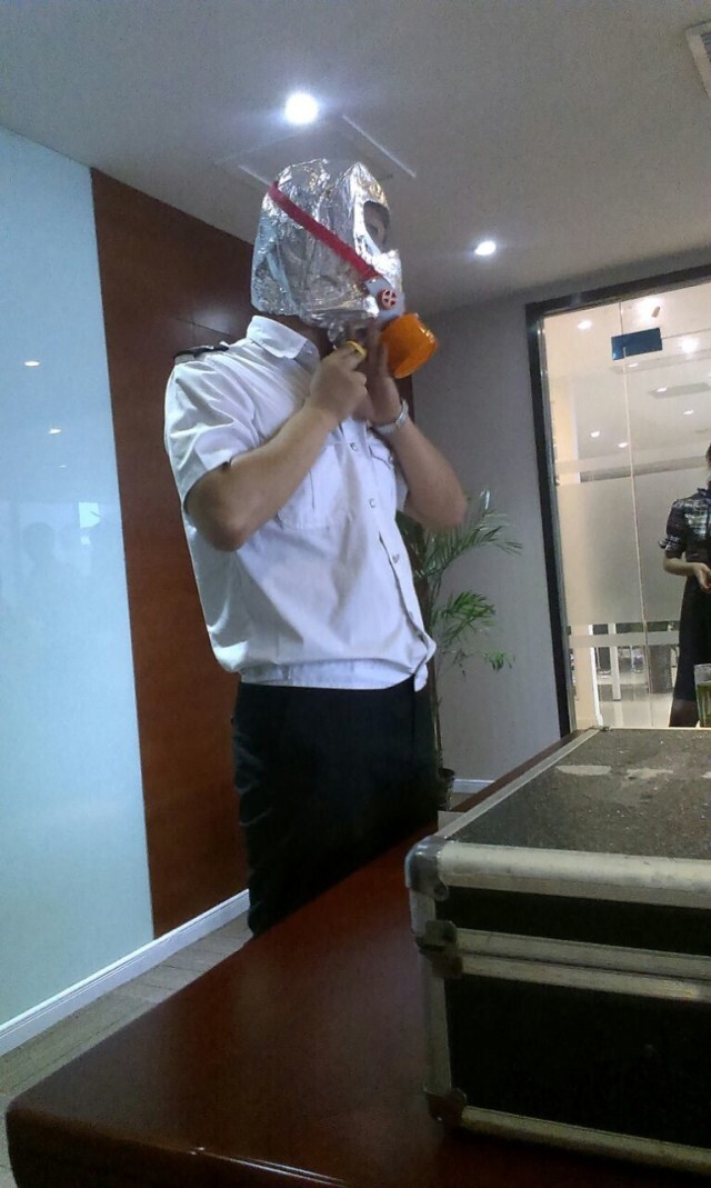 到了逃生環節,講師拿出了簡單制作的面具,他邊戴在頭上,邊向人們講解面具使用的重要性:“火災對人的影響,大部分是煙塵阻塞呼吸道導致窒息,而怎樣保證我們呼吸的順暢才是致命的關鍵,首先應拿到簡易面具,這種面具效果好,而且比較輕便又有良好的視野保證人們的逃生,若是身邊沒有面具的話可以將手邊的毛巾浸濕捂住口鼻,禁止煙塵進入呼吸道導致窒息”,人們在于講師的講解下紛紛將簡易的面具拿在手中并套在頭上試戴,通過一番對于逃生知識的理解和實驗,人們對于火災求生也有了較為客觀的認識。