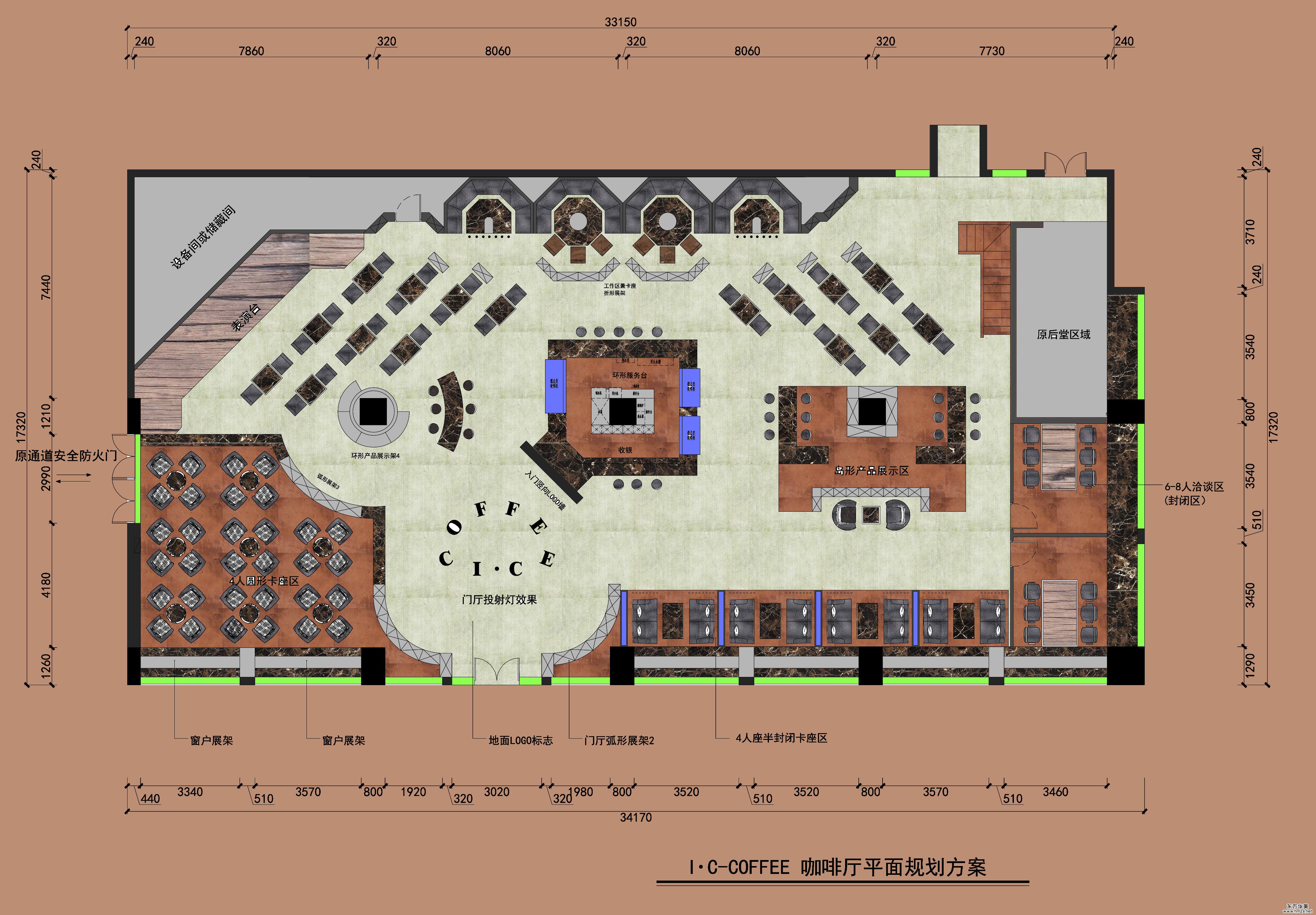 ▄設(shè)計(jì)風(fēng)格定位: 針對(duì)當(dāng)下咖啡廳特色、特點(diǎn)、結(jié)合IC咖啡的品牌、形象、服務(wù)、理念,由此裝飾設(shè)計(jì)的訴求點(diǎn)在未來(lái)5-15年的經(jīng)營(yíng)過(guò)程中完勝于周圍已存在的類似性經(jīng)營(yíng)場(chǎng)所。因項(xiàng)目處于建筑物一層,市政綠化帶以內(nèi)無(wú)視線阻擋,視線開闊,門頭設(shè)計(jì)可反向于原建筑幕墻體增加咖啡廳的特點(diǎn),又不失檔次,夜幕下利用櫥窗展示體現(xiàn)出亮化效果。 此案例的主要風(fēng)格是復(fù)古工業(yè)風(fēng),空間布局上以環(huán)形動(dòng)線為主,分為入場(chǎng)主動(dòng)線、入各功能區(qū)輔助線、展示區(qū)觀賞停頓動(dòng)線,環(huán)型服務(wù)臺(tái)可服務(wù)四周。以經(jīng)營(yíng)者的思路易進(jìn)不易出的動(dòng)線設(shè)計(jì),橫向流動(dòng),豎向45度向內(nèi)引導(dǎo)“八”字形設(shè)計(jì),聚焦于前位島式展臺(tái)、中位環(huán)形服務(wù)臺(tái)、內(nèi)位表演區(qū)及藝術(shù)長(zhǎng)廊式展架,第一個(gè)點(diǎn)都留有讓消費(fèi)者駐足的理由。 在空間構(gòu)成上,呈現(xiàn)出最佳設(shè)計(jì)效果,材料的合理運(yùn)用體現(xiàn)了裝飾的最佳立體質(zhì)感,局部采用金屬色、銹紅色以及深色,為了更好的體現(xiàn)整個(gè)咖啡廳的氛圍,立面材料運(yùn)用多元而不繁雜,燈光和家具的選用也是重中之重。