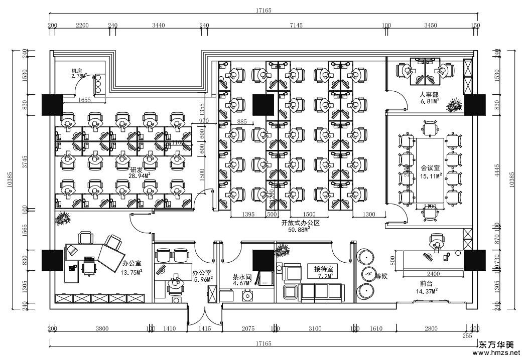 ▄原建筑結構分析: 總經理辦公室、財務室和一些特別的會議室外,建議采用全通透或者半通透的隔斷,這樣可以增加企業融合力和方便交流,也便于員工互相監督。在裝修設計中要突出重點區域,抓住幾個關鍵點,例如前臺、會議室、總經理辦公室等空間。要盡可能少地采取大的裝修結構和造型,多用燈光和色彩以及現代化的配飾組合取得良好的裝飾效果。